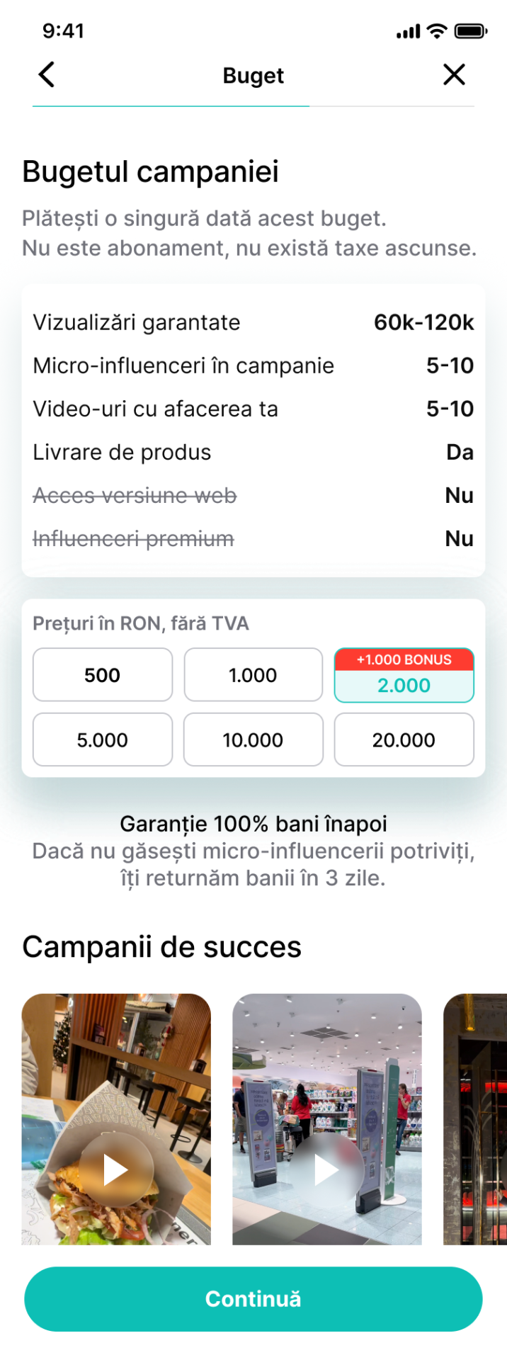 Pentru a putea invita micro-influenceri, trebuie să avem bugetul alocat. Nu-ți face griji, îți poți primi banii înapoi dacă nu ești mulțumit de micro-influencerii care au aplicat.